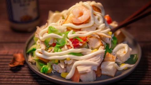 鸡胸肉有韧劲,大虾仁够Q弹,面包干或者紫薯饭又会有不同的口感,当然如果你觉得口淡,一点点沙拉酱绝对是锦上添花。