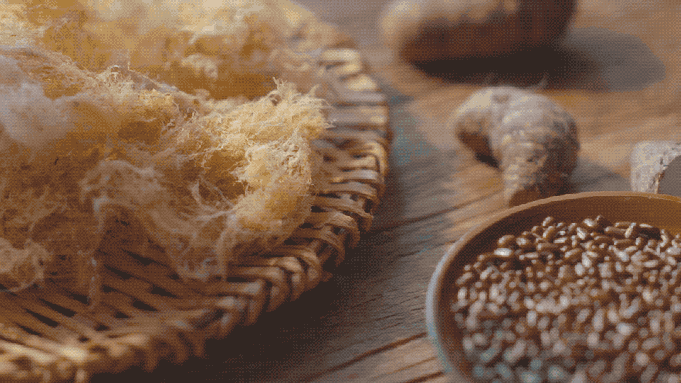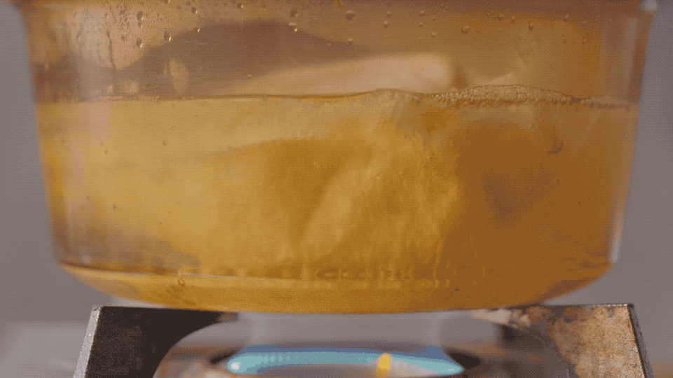 然后再准备好一大锅水,放进装好袋的石花草,慢煮一小时。时间到,取出放凉,等待半小时,就能凝固成石花膏了。