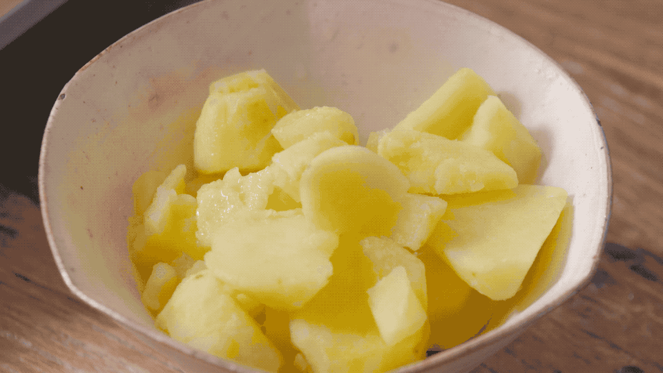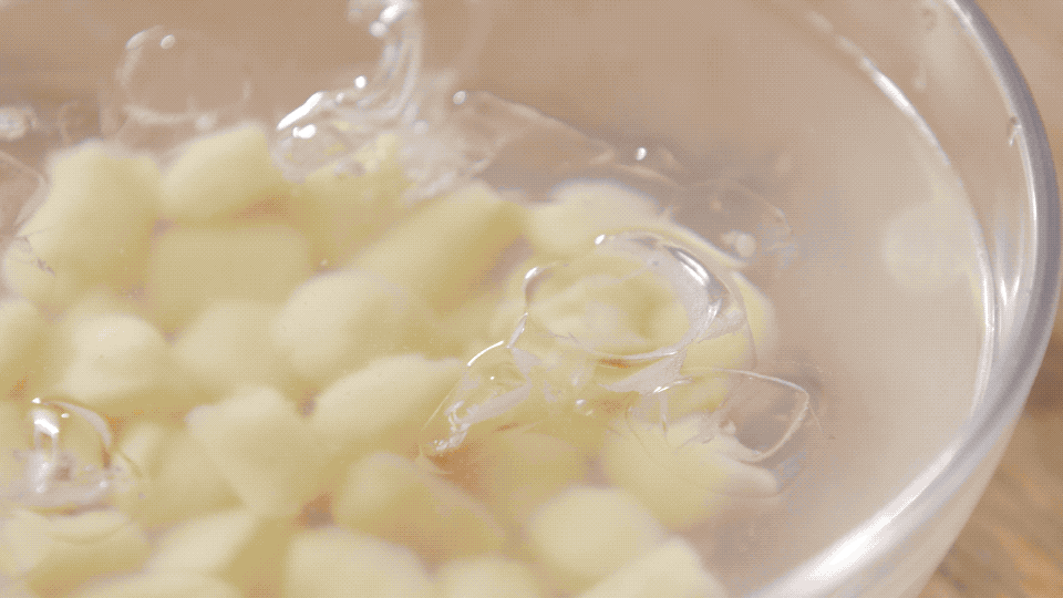 切好的阿达子撒上面粉,待水烧热后下入阿达子,约2分钟,阿达子一个个浮出水面后捞出过冰水。