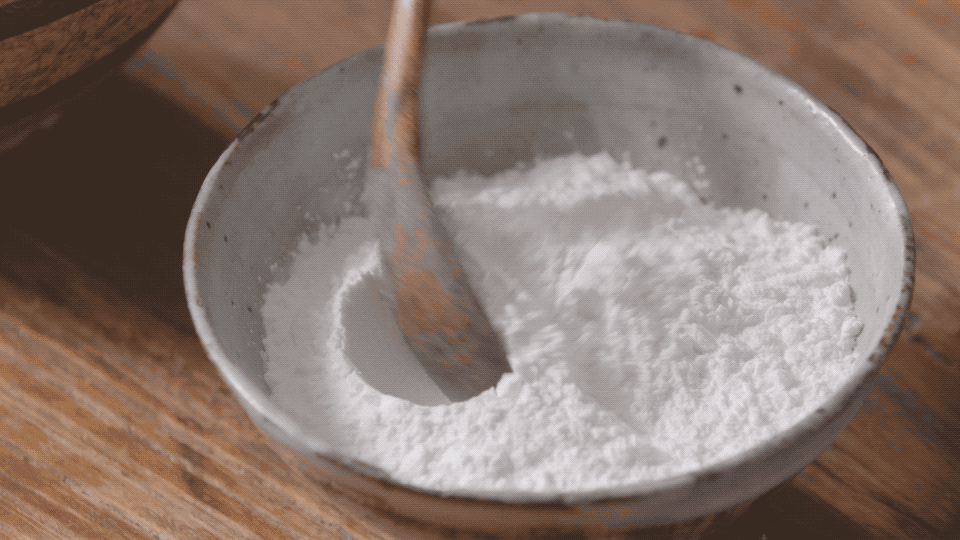 在碗中加入少许木薯粉,再倒入先前备好的开水搅拌,一点粉一点开水慢慢搅到白色团变大,成形;移至案板上慢慢揉搓面团,中途若太粘可继续加木薯粉;