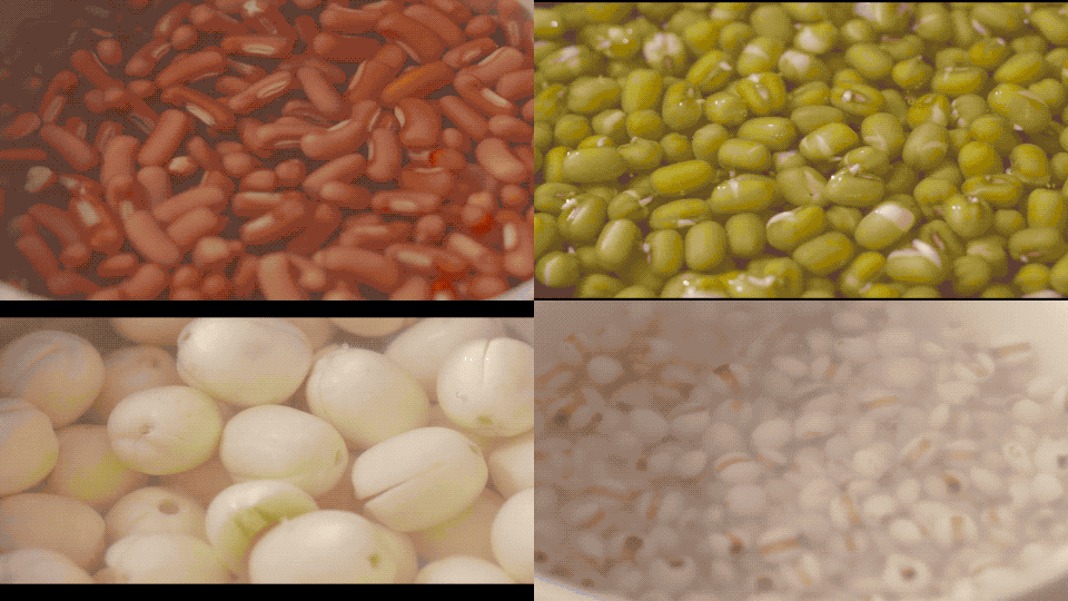 另外分别煮熟或蒸熟其他的配料:红豆、绿豆、莲子、薏仁、芋头,还有清爽的水果也切好备一边。