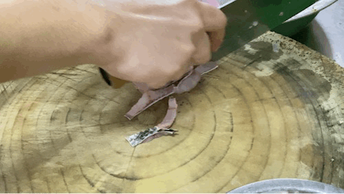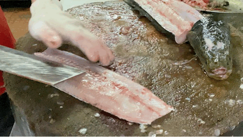 为保持鱼肉干净,阿东“放血”更是讲究。精准地在鱼的下颌和尾部割一刀,再将鱼放入清水中放掉淤血,最后用刷子清洁内脏。熬生鱼粥,需要切鱼肉。虽然无须像制作鱼生一样,把鱼肉“片”得薄如蝉翼,但对刀工的考验依然不小。鱼肉要片片均匀才算合格。