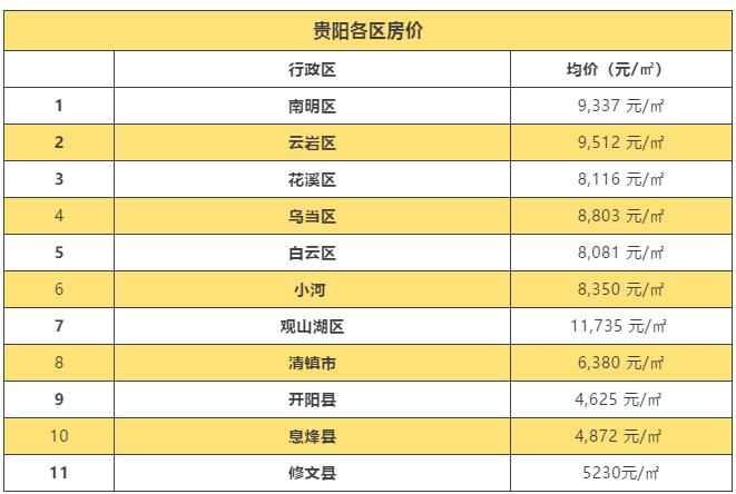 房价最高贵阳观山湖区(11,735 元/㎡)