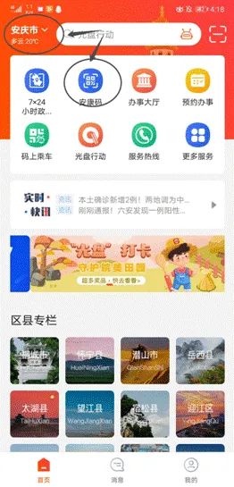 第一步:打开皖事通——选择安庆市——选择安康码