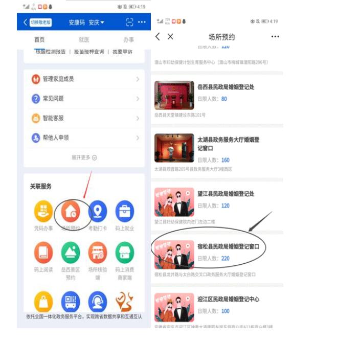 三、预约方式下载、注册“皖事通”APP,申领“安康码”,在“安康码”页面进入“场所预约”点击“婚姻登记”选择“宿松县民政局婚姻登记处”进行预约(操作指南见附件)。