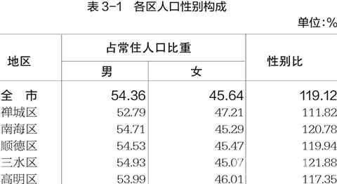 佛山常住人口中,男性人口为516.38万人,占54.36%;女性人口为433.50万人,占45.64%。总人口性别比(以女性为100,男性对女性的比例)为119.12,仅低于东莞(130.06)、深圳(122.43)排名全省第三。