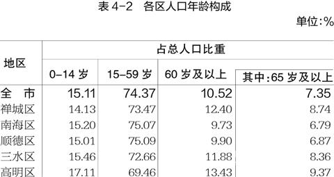 但与全省平均水平相比,佛山依然是年轻和极具活力的城市:0-14岁和60岁及以上人口比重分别低于全省平均水平3.74和1.83个百分点,而15-59岁人口比重仍高于全省5.57个百分点,仅次于东莞、深圳、中山、广州排名全省第五(60岁及以上人口比重之低排在深圳、东莞、中山、珠海、惠州之后列全省第六),更比全国平均水平高出11.02个百分点。05