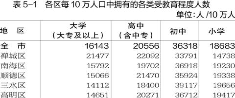 与2010年相比,每10万人中拥有大学文化程度的由9469人上升为16143人,排在深圳、广州和珠海之后名列全省第四。可见,拥有高中及以上文化程度的人口比重上升,而拥有初中及以下文化程度的人口比重下降,人口素质得到持续改善。