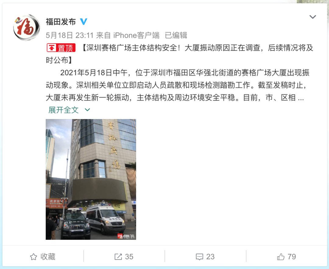 2021年5月18日中午,位于深圳市福田区华强北街道的赛格广场大厦出现振动现象。深圳相关单位立即启动人员疏散和现场检测踏勘工作。截至发稿时止,大厦未再发生新一轮振动,主体结构及周边环境安全平稳。目前,市、区相关部门正联合展开调查,后续情况将及时向社会公布。