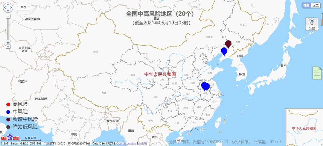 截至2021年5月19日9时,全国31个省(自治区、直辖市)和新疆生产建设兵团共有0个高风险地区,20个中风险地区,其中安徽省7个,辽宁省13个。