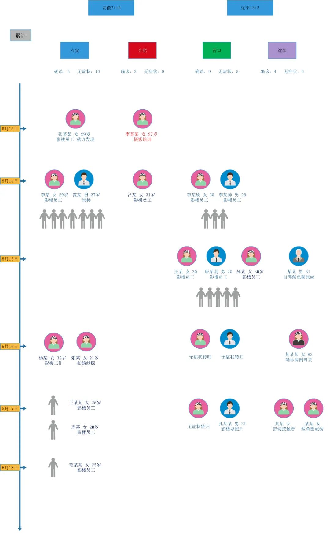 本轮辽皖疫情, 截止5月18日24时,累计报告确诊病例20例,其中安徽7例,辽宁13例;累计报告无症状感染者15例,其中安徽10例,辽宁5例。