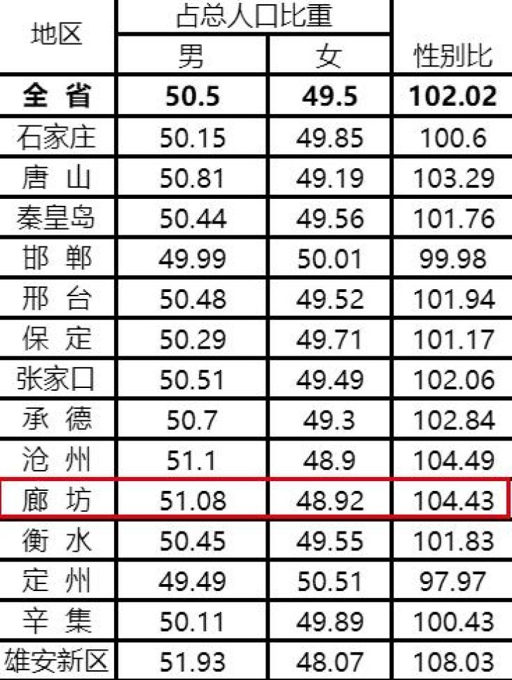 根据河北省第七次全国人口普查结果,现将2020年11月1日零时全省及各市(含定州、辛集市)、雄安新区人口性别构成情况公布如下: