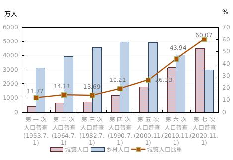 全省常住人口中[3],居住在城镇的人口为44816486人,占60.07%;居住在乡村的人口为29793749人,占39.93%。与2010年第六次全国人口普查相比,城镇人口增加13241158人,乡村人口减少10485133人,城镇人口比重提高16.13个百分点。