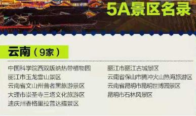 截至目前,全国共有304家5A景区,云南有9家,分别为:中国科学院西双版纳热带植物园;丽江市玉龙雪山景区;丽江市丽江古城景区;云南省文山州普者黑旅游景区;大理市崇圣寺三塔文化旅游区;迪庆州香格里拉普达措景区;云南省保山腾冲火山热海旅游区;云南省昆明市昆明世博园景区;昆明市石林风景区。昆明主城60万个车位可通过手机预约停车