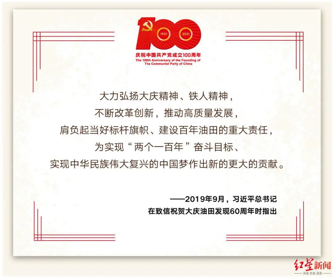 2019年9月26日,在大庆油田发现60周年庆祝大会上,习近平总书记发来贺信。贺信中指出:大庆油田的卓越贡献已经镌刻在伟大祖国的历史丰碑上,大庆精神、铁人精神已经成为中华民族伟大精神的重要组成部分。