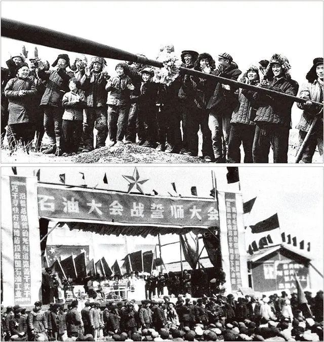 ▲上图为1959年9月26日,松基三井喜喷工业油流,标志着大庆油田的发现。下图为1960年4月29日,石油大会战誓师大会。图据《求是》杂志