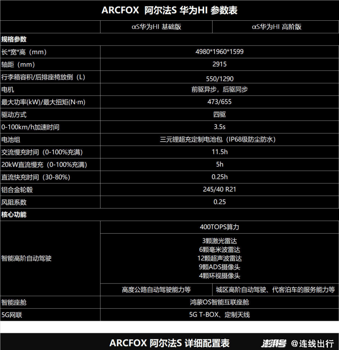 极狐阿尔法S华为HI参数表,图源极狐官网