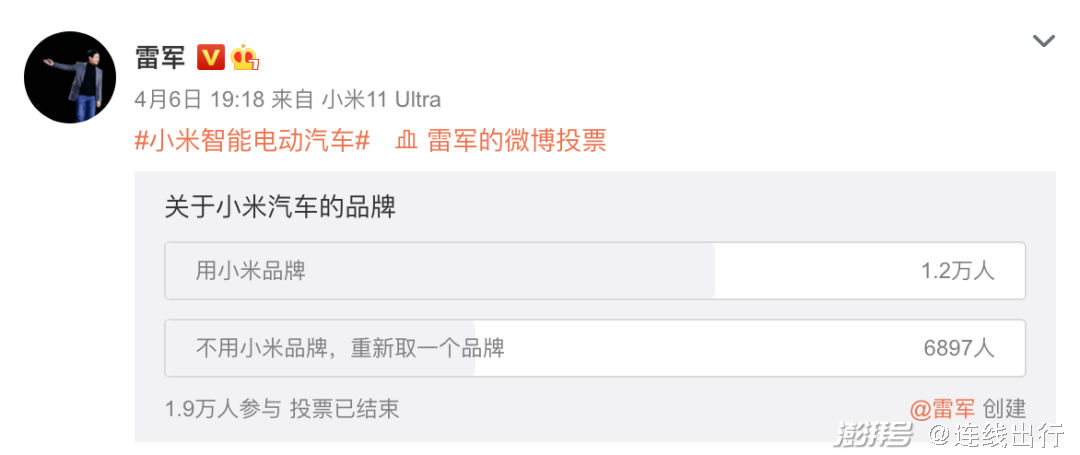 在这场直播开始前,雷军也在社交平台上发起了有关小米汽车品牌的投票,共有1.9万名网友投票,结果显示1.2万人希望小米继续使用“小米”作为汽车品牌,6897人希望重新成立品牌造车。