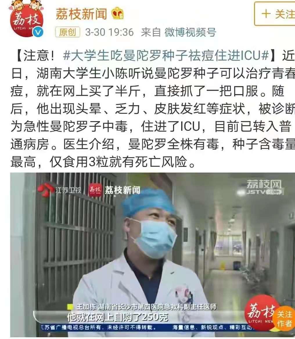 一个多月前,一名爱美的大学生相信“网络偏方”,网购半斤曼陀罗种子治疗青春痘,他抓了一把口服后,第二天因急性中毒住进了ICU。