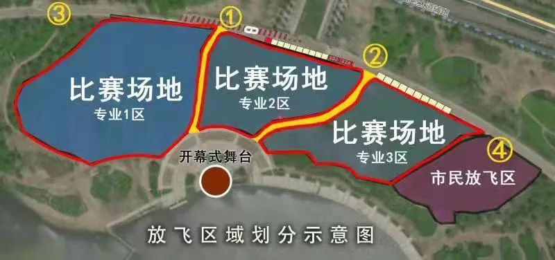 市民可以通过图示①②木栈道和③④区域抵达开幕式舞台区域前观看启动仪式。