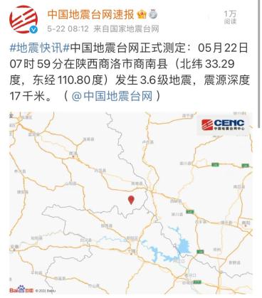 中国地震台网正式测定:5月22日7时59分在陕西商洛市商南县(北纬33.29度,东经110.80度)发生3.6级地震,震源深度17千米。