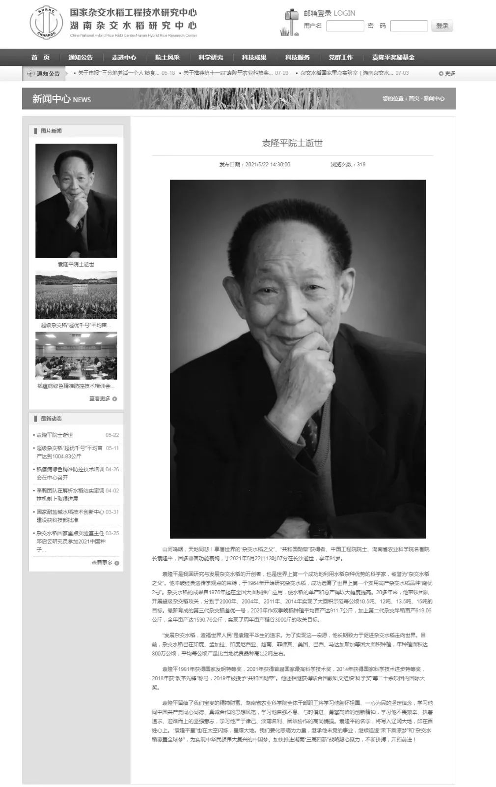 袁隆平院士逝世让全国陷入悲痛。他曾任职的国家杂交水稻工程技术研究中心暨湖南杂交水稻研究中心发文悼念:“袁隆平的名字,将写入辽阔大地,印在百姓心上。‘袁隆平星’也在太空闪烁,星耀大地。”悼文强调:“我们要化悲痛为力量,继承他未竟的事业,继续追逐“禾下乘凉梦”和“杂交水稻覆盖全球梦”,为实现中华民族伟大复兴的中国梦、加快推进湖南“三高四新”战略凝心聚力,不断拼搏,开拓前进!”