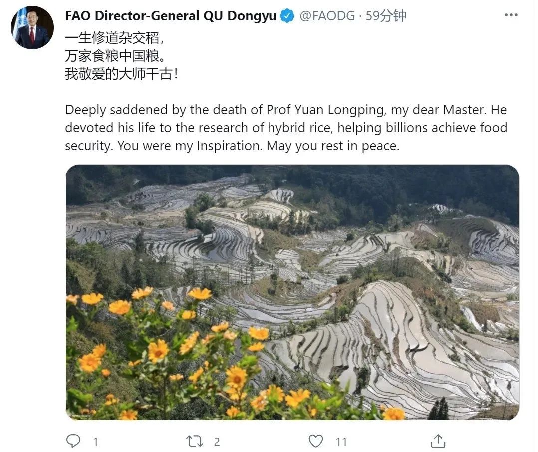 联合国粮农组织总干事屈冬玉在推特平台发文悼念:“一生修道杂交稻,万家食粮中国粮。我敬爱的大师千古!”他同时盛赞袁隆平院士“毕生致力于杂交水稻的研究,帮助数十亿人实现了粮食安全。”联合国发文哀悼:“袁隆平院士为推进粮食安全、消除贫困、造福民生做出了杰出贡献!国士无双,一路走好。”