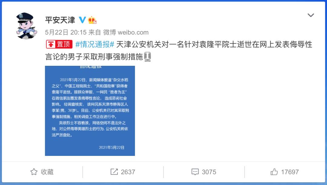 22日20时,天津市公安局通报,接群众举报,一网民“胜者为王”在微信朋友圈针对袁隆平院士逝世发表侮辱性言论,造成恶劣社会影响。经调查核实,该网民系天津市静海区人李某(男,38岁)。目前,公安机关已对其采取刑事强制措施,相关调查工作正在进行中。