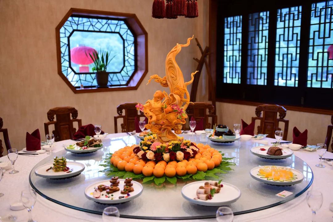 中华橘宴共十六道菜肴,分别为一道前菜、十二道热菜和三道点心。