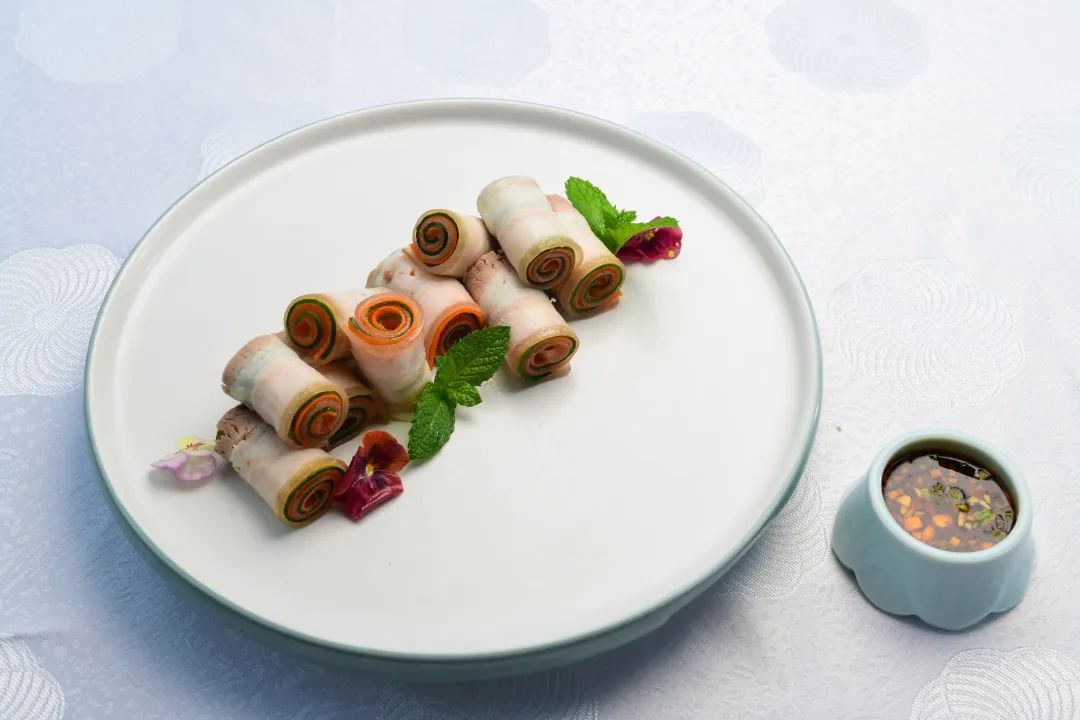 “橘神迎宾”以颇具神韵的橘神雕像为装饰,由八道冷菜拼盘作为前菜,分别有:宁溪牛肉、屿头板栗、上垟焖笋、富山白肉、长潭溪鱼、沙埠菜头、永宁肠卷、澄江橘乐,均是黄岩各地的经典小吃,多元美味。