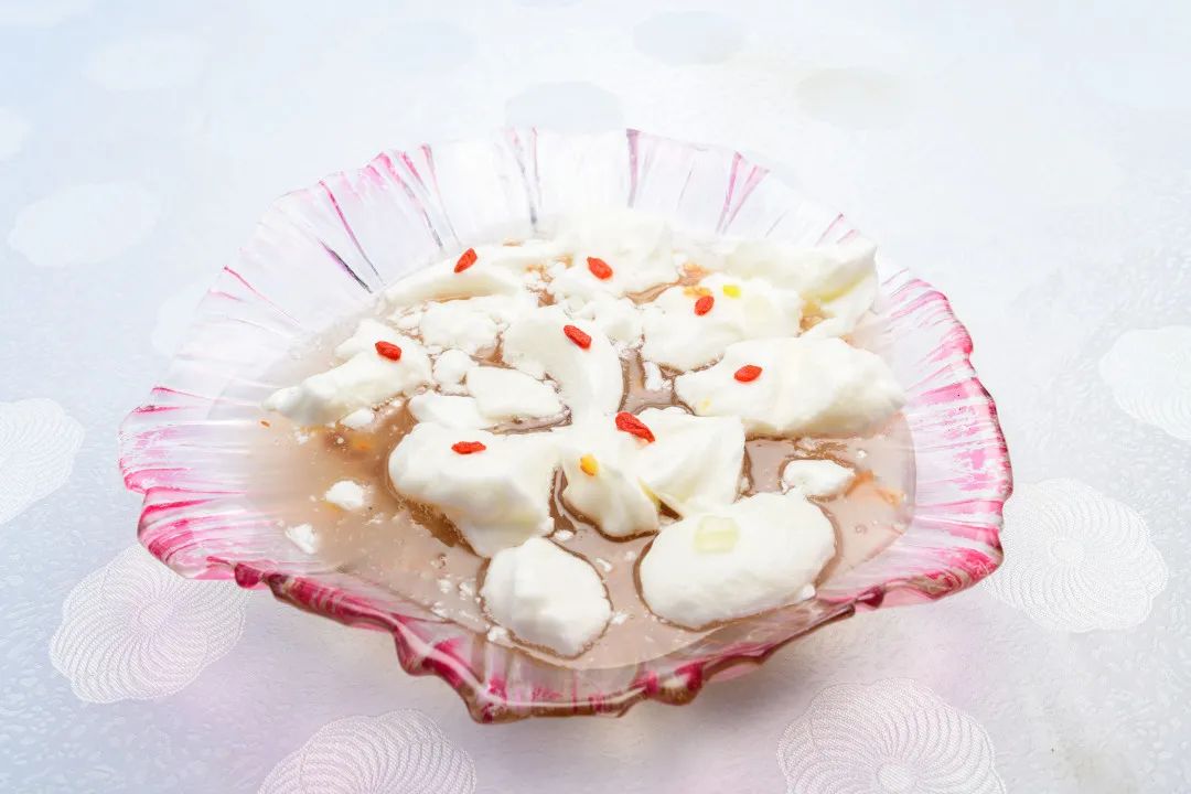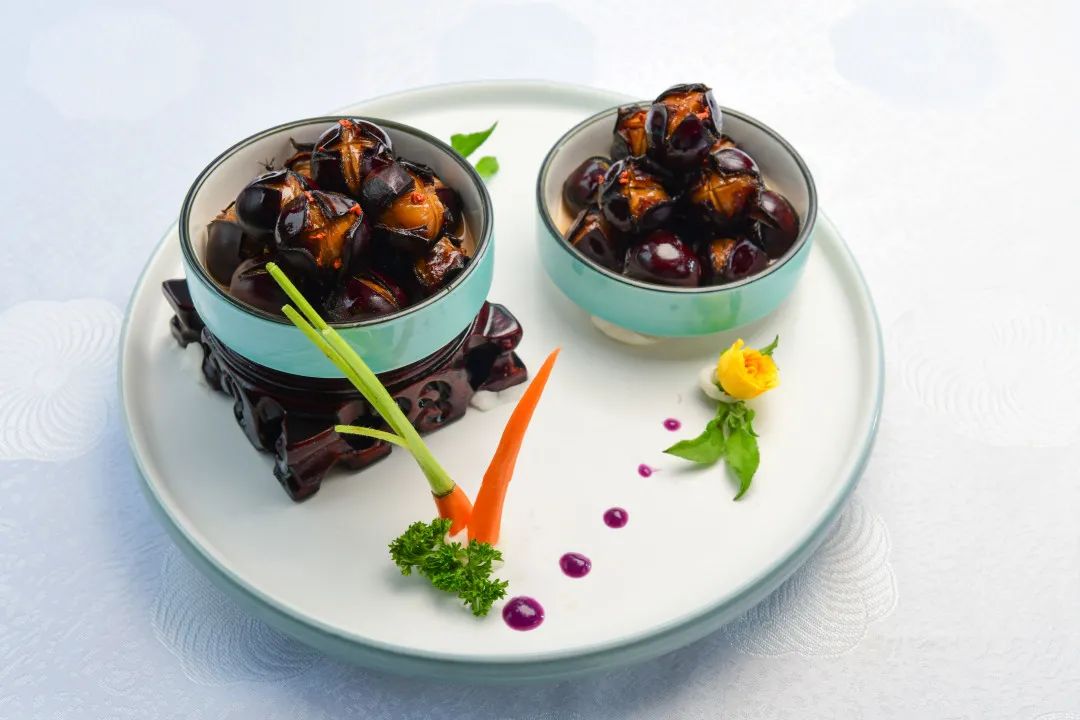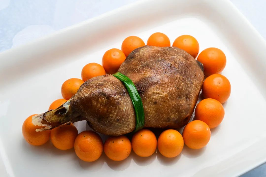 橘花献瑞是将金桔、糯米圆子、蜜枣等用打发的蛋清加以蒸制而成,外观白嫩如雪,整道菜有一种独特的清香。