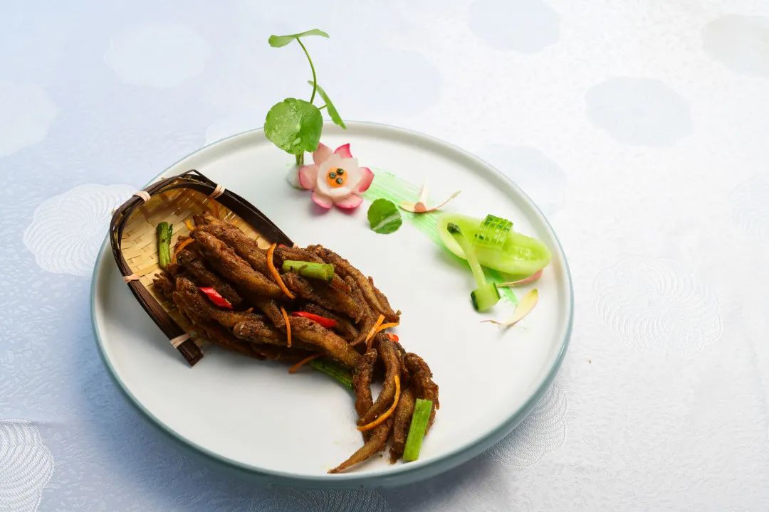 烹饪后的长潭小湖虾成色金黄、松脆鲜香,夹杂着丹橘的酸甜滋味,是一道配酒可醉忘人间的菜肴。