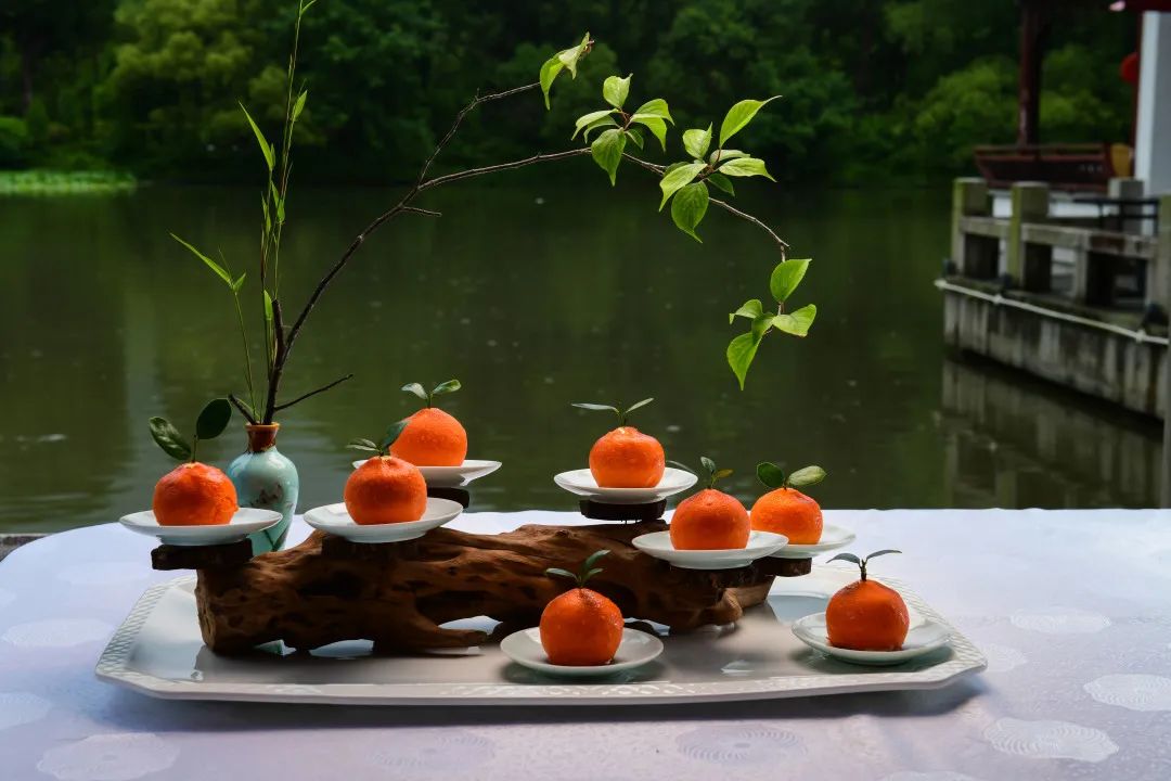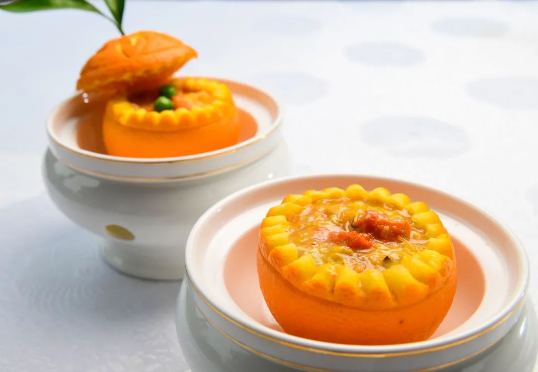 橙黄橘绿取材于田蟹,蒸熟后取蟹粉,摘取带有绿叶的新鲜橘子,在橘皮表面刻如意纹,上笼蒸制。果酸与蟹肉溶合,是口味清新与艺术质感并存的一道菜肴。