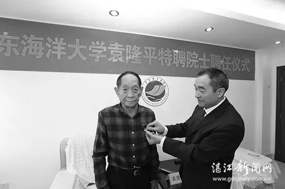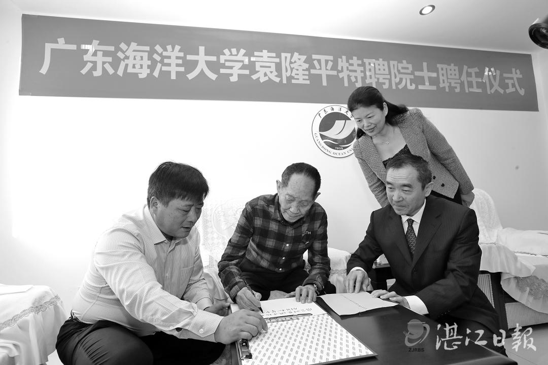 2019年12月,在位于三亚的国家杂交水稻工程技术研究中心海南基地,举行了一场特别的聘任仪式。“杂交水稻之父”、中国工程院院士袁隆平从广东海洋大学党委书记曹俊明手中接过聘书,正式受聘为该校特聘院士。袁隆平表示希望能与广东海洋大学教授专家共同努力,研究选育耐盐碱高产水稻,并将第三代杂交水稻尽快应用到生产上,为国家粮食生产作出更大的贡献。