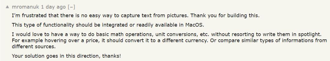 对于 macOCR 命令行应用程序,网友给予了高度评价。网友 @mromanuk 表示:「我很沮丧的是,一直以来没有简单的方法来提取 Mac 图片中的文本。现在 macOCR 弥补了这一空白!这一功能应该在 MacOS 中集成或随时可用。」