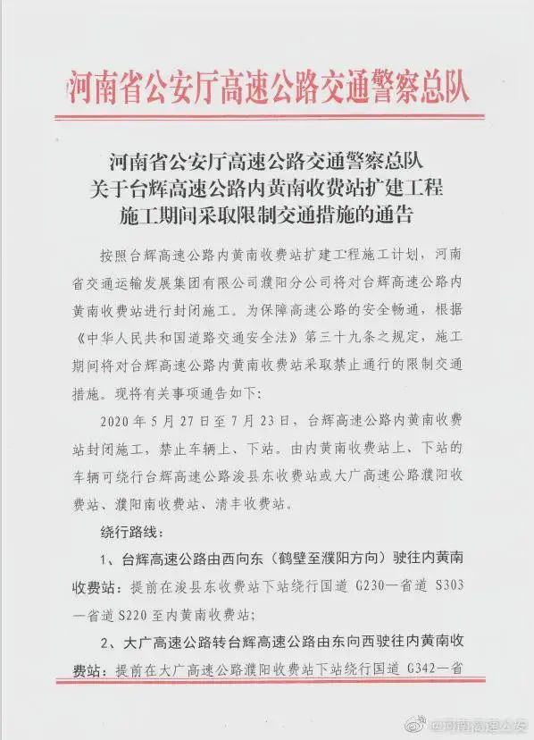 2020年5月27日至7月23日,台辉高速公路内黄南收费站封闭施工,禁止车辆上、下站。由内黄南收费站上、下站的车辆可绕行台辉高速公路浚县东收费站或大广高速公路濮阳收费站、濮阳南收费站、清丰收费站。