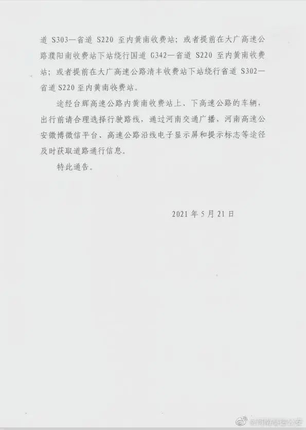 途经台辉高速公路内黄南收费站上、下高速公路的车辆,出行前请合理选择行驶路线,通过河南交通广播、河南高速公安微博微信平台、高速公路沿线电子显示屏和提示标志等途径及时获取道路通行信息。