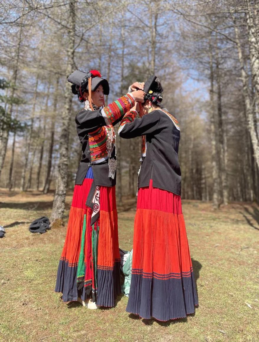 阿合石里(左)和小伙伴整理彝族彩裙阿铁说日心中的童谣传习班,不仅教授音乐,更是孩子们的庇护所。在这个没有血缘关系的大家庭,他希望孩子们拥有温暖,获得力量。