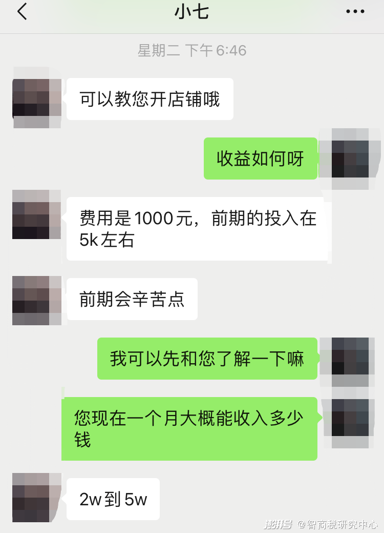 小七告诉智商税研究中心,自己是和一个男性朋友一起开淘宝店,各自负责一半业务,每个月的收入在两万到五万之间,另外,他们还帮助其他人做哄睡淘宝店,从淘宝开店、运营到店铺开业可以全部负责,每个店铺的费用是1000元。
