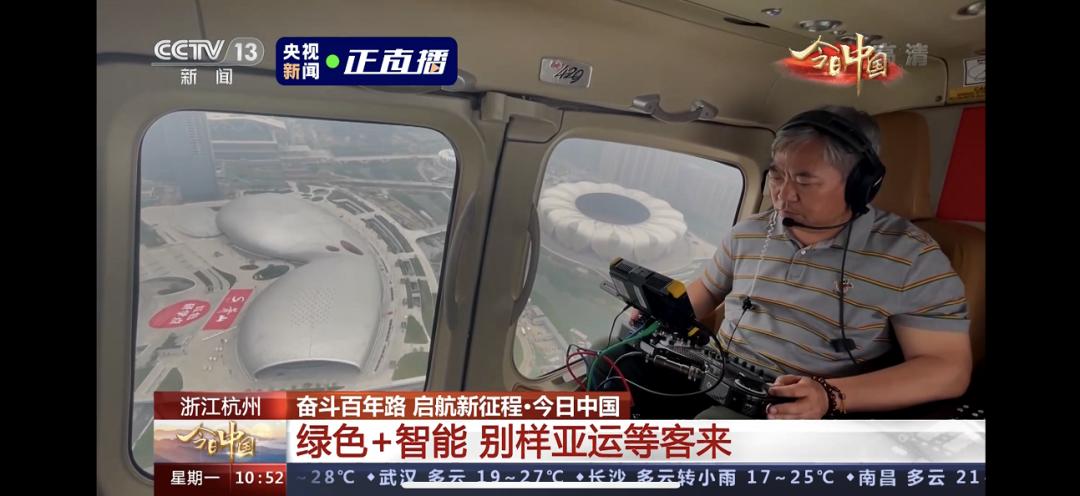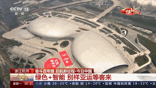 随着直升机向东飞行,飞跃萧山红色研学点——奥体中心主体育馆和游泳馆,这两个场馆就像是蝴蝶的一双张开的翅膀,充分展现了杭州2022亚运会绿色、智能、节俭、文明的理念,是杭州“拥江发展”的新地标。