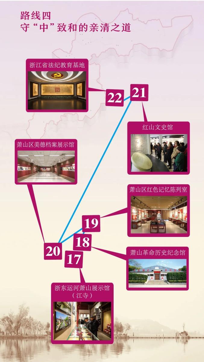源溯运河,梦回千年。“黄金水道”繁荣了萧山的经济,也孕育了浓厚的运河文化。萧山人民铭记峥嵘岁月,不忘赤诚之心,在萧然之“中”缅怀革命先烈、致敬楷模先锋,在一路的追寻敬仰中,聆听最萧山的革命之声。清风相伴、弦歌不绝,法纪教育引领下的萧山人民稳步前行。线路五