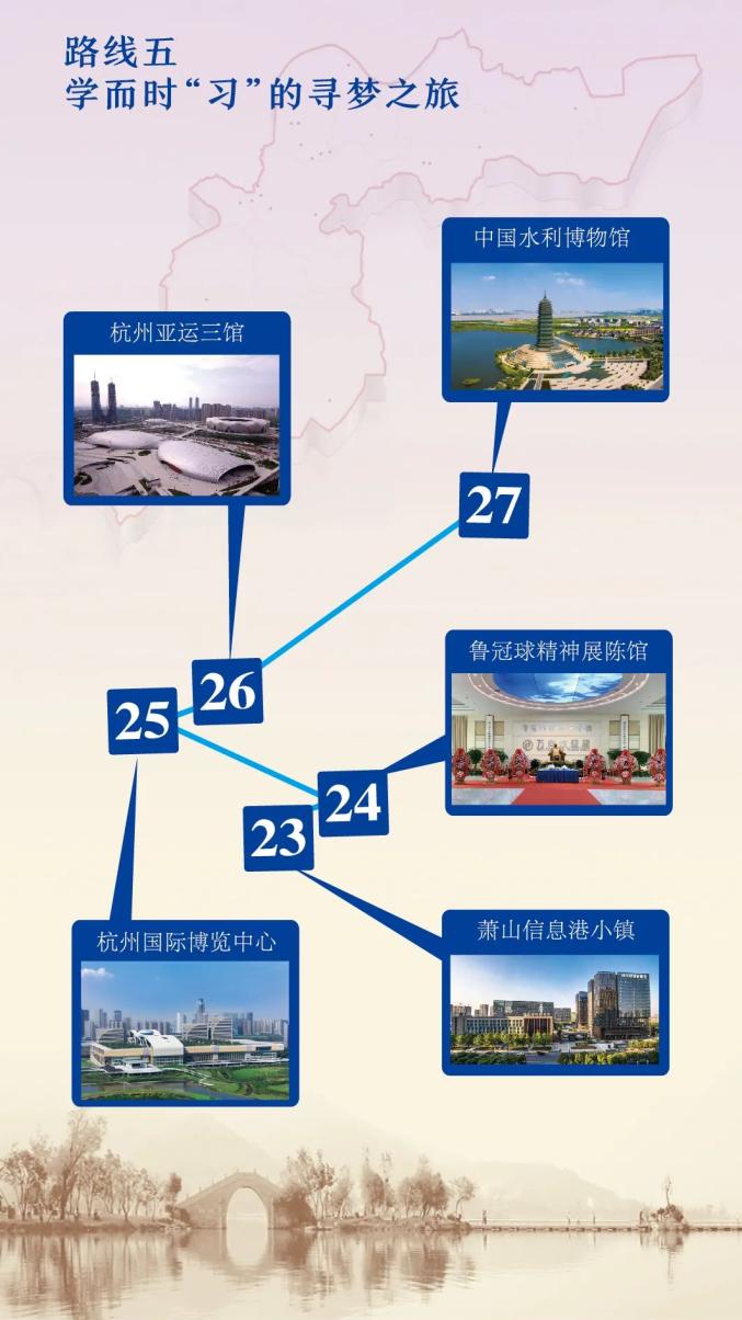 万向聚能,众志成城;弄潮精神,向涛头立;忆苦思甜,创新成长;抓住机遇,注入活力。追随习总书记的脚步,萧山定将奋力打造“重要窗口”示范样板,以“互联网+”“人工智能+”“数智亚运”为核心,镌刻“萧山坐标”,澎湃“中国动力”,努力铺设一条更大、更强、更优的寻梦之道,谱新篇、开新局。线路六