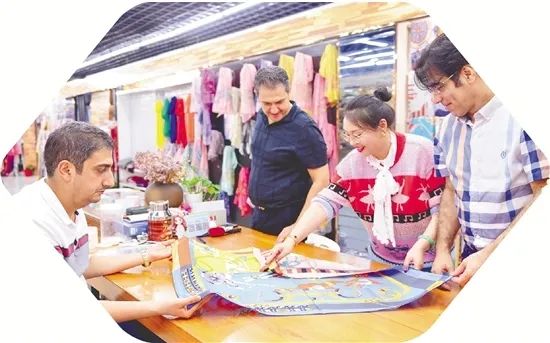 义乌市场经营户向国外客户展示真丝斜纹绸缎围巾 吴峰宇 摄
