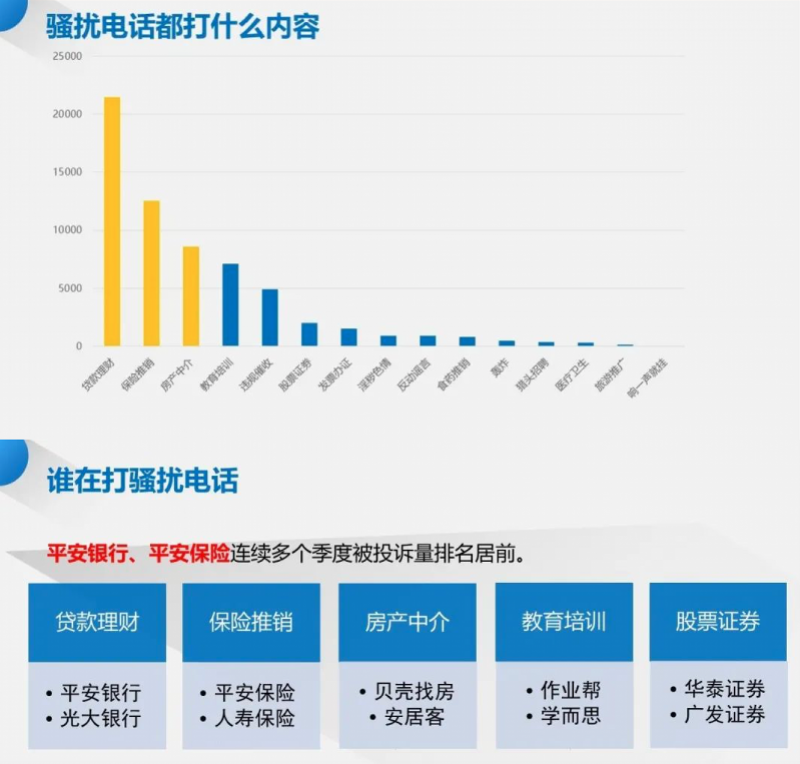 据悉,骚扰电话内容最高频次的为贷款理财、保险推销、房产中介、教育培训、违规催收等。平安银行和平安保险连续多个季度被投诉量排名居前,此外如贝壳找房、安居客、学而思、作业帮等企业也有上榜。