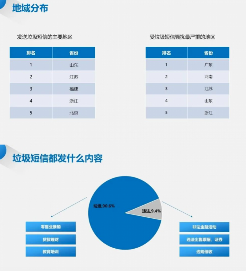 而在垃圾短信投诉情况上,发送垃圾短信的主要地区依次为山东、江苏、福建、浙江、北京;受垃圾短信骚扰最严重的地区则为广东、河南、江苏、山东、浙江。