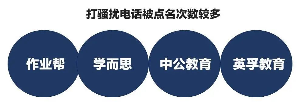 梳理发现,“工信微报”公布的“2020年第四季度垃圾信息投诉情况”中,教育培训领域骚扰电话方面,中公教育、英孚教育被点名;垃圾短信方面,掌门优课、高途课堂投诉量排名居前。而“2021年第一季度垃圾信息投诉情况”显示,骚扰电话方面,作业帮、学而思被点名。