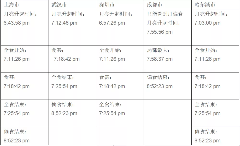 根据紫金山天文台预报,本次月全食(红月亮):初亏17时45分;食既19时09分;食甚19时19分,最大食分1.015;生光19时28分;复圆20时53分。当天,我国部分城市的月出时间是(按先后排列):台北18时31分,上海18时44分,南京18时57分,深圳18时58分,青岛19时00分,广州19时02分,哈尔滨19时04分,北京19时27分。