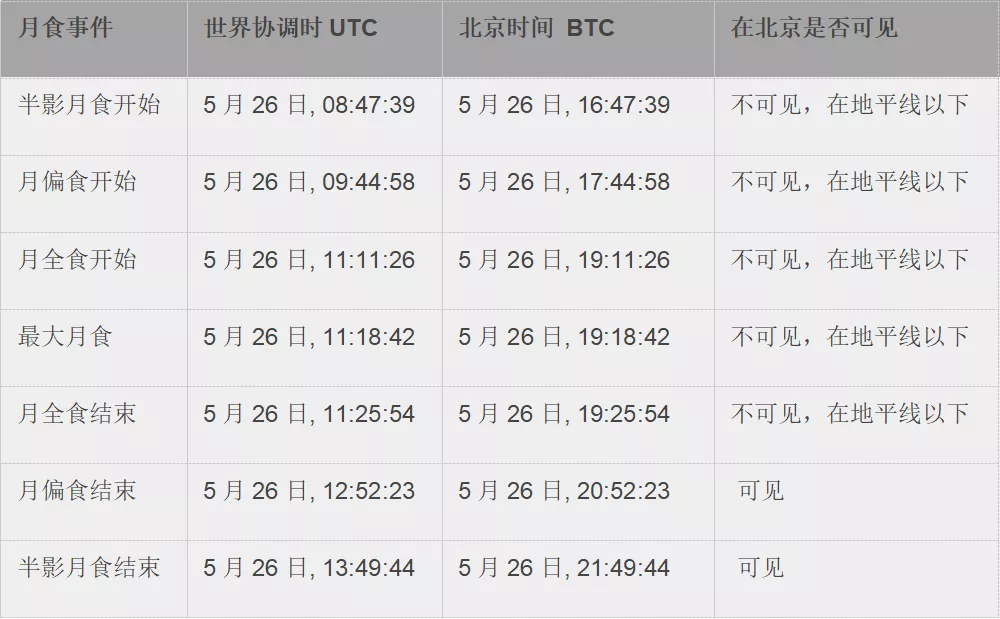 观赏时间:北京时间19:11全食开始,19:25全食结束,20:52偏食结束。