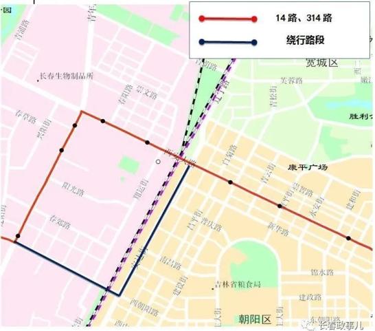 14路、314路绕行方案:绕行皓月大路⇌朝阳桥⇌安达街至西安大路回到原线。