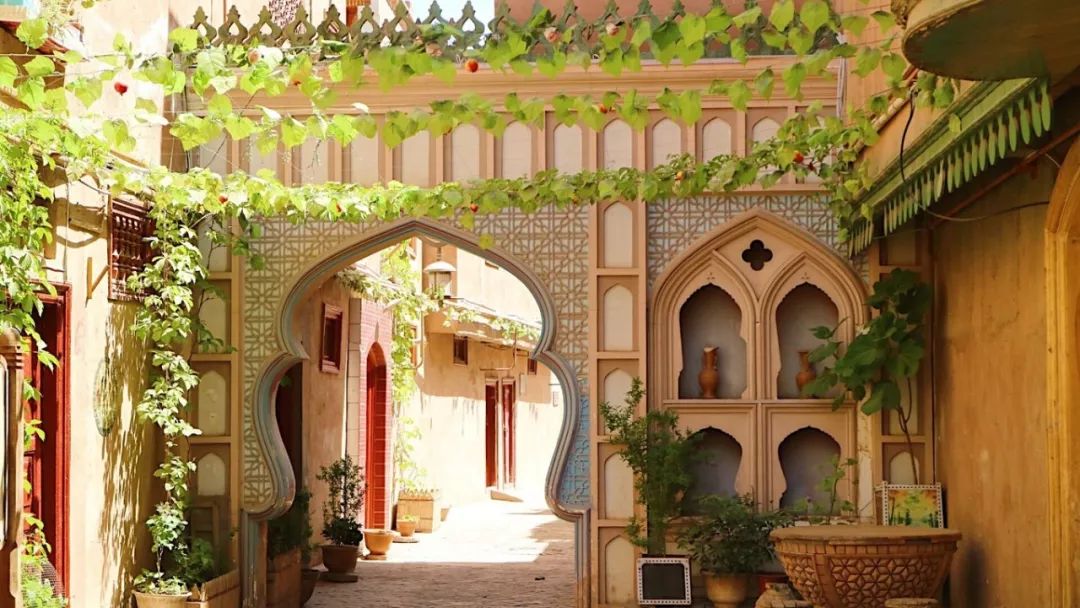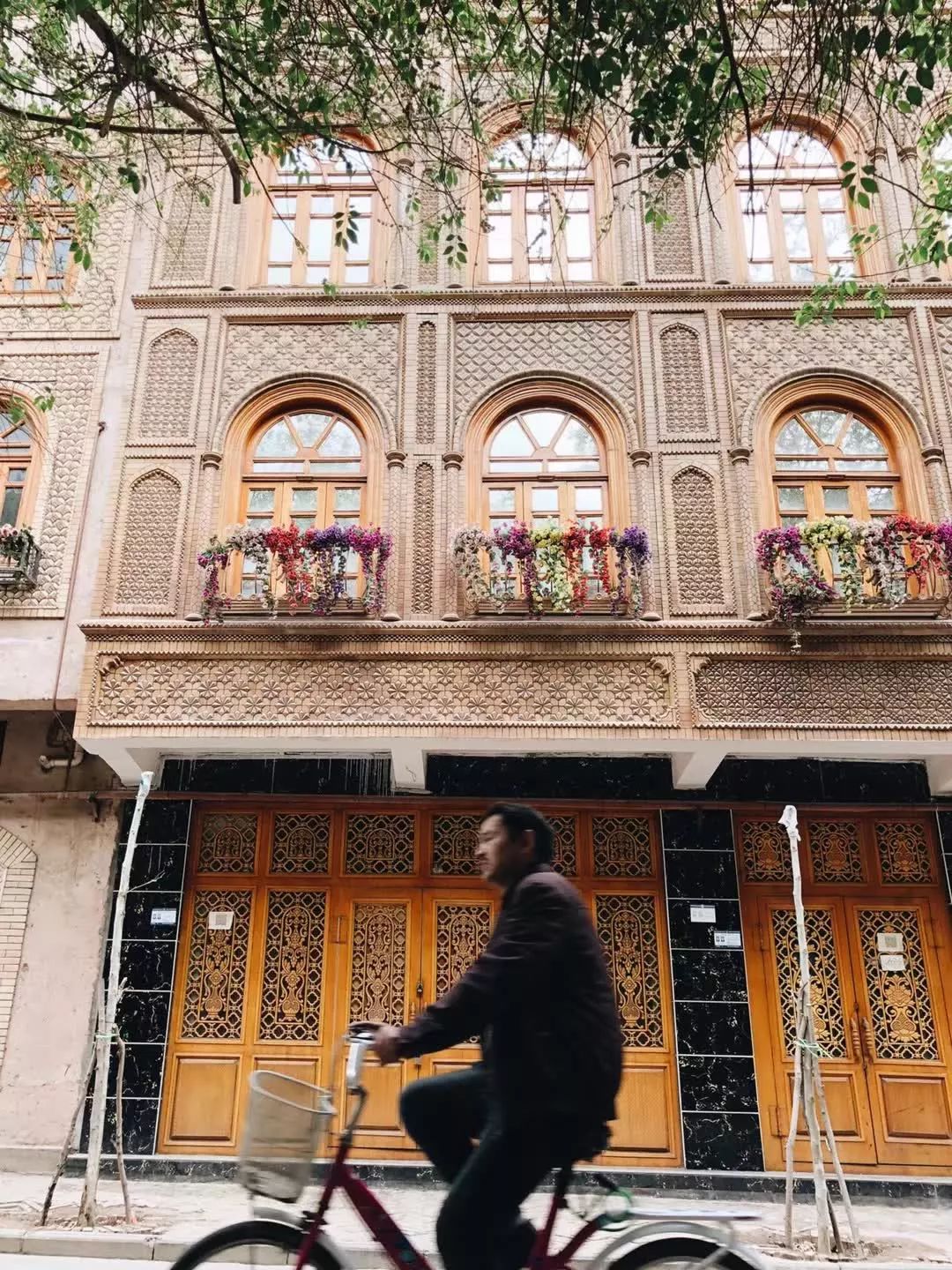 老城里家家都有晾台,位于平面屋顶或侧面,用于养花或置放盆景。盆景、鲜花与建筑物廊柱、木雕上的各色花饰交相辉映,幽静清新。试想,一片土色的城市,配上生猛的花、浓艳粗犷的墙毯、纹理鲜明细致的门,那该是怎样别无二致的维族风情。